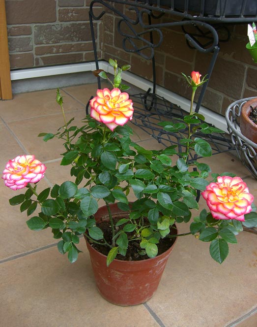 オレンジのぼかしに濃いピンクの縁どりがとてもキレイなミニバラです。