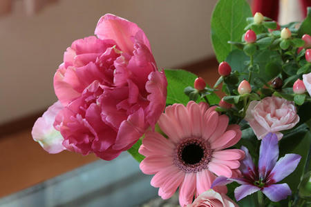 パープルのマーガレットみたいな花は名前を忘れてしまいましたがこのピンク〜ローズ系の色合わせにぴったりかと思って一緒に連れて帰りました