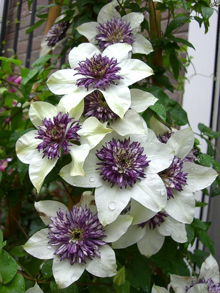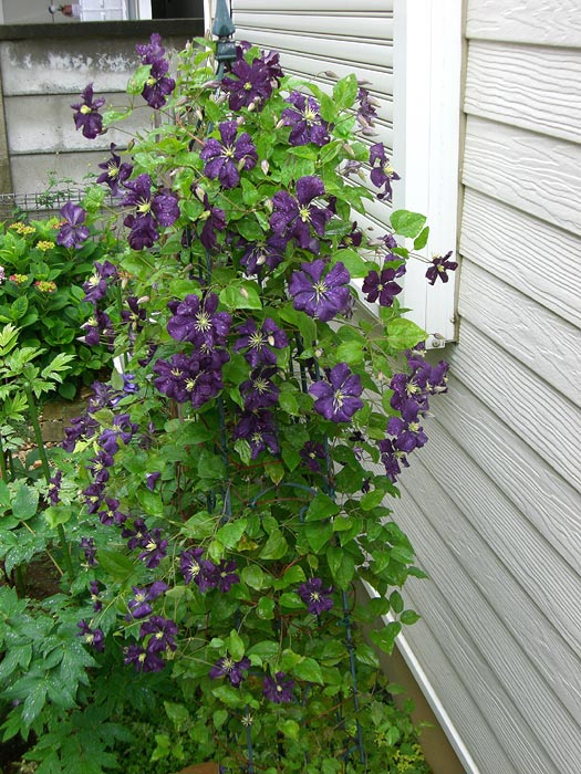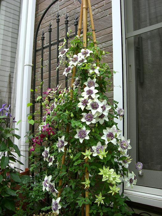 新しい花壇にたてたトレリスにはただいまテッセンと白万重が満開中。